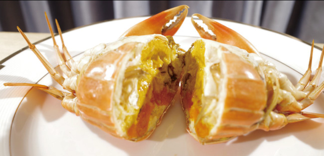 黃油相融,難分彼此。油膏浸滿整只蟹身,腹肉、蟹腿、蟹螯,甚至蟹腮,全身都金黃透光。細(xì)細(xì)品嘗,渾身散發(fā)一股霸道的鮮甜,是普通青蟹的10余倍,簡(jiǎn)直就是“人間尤物”。